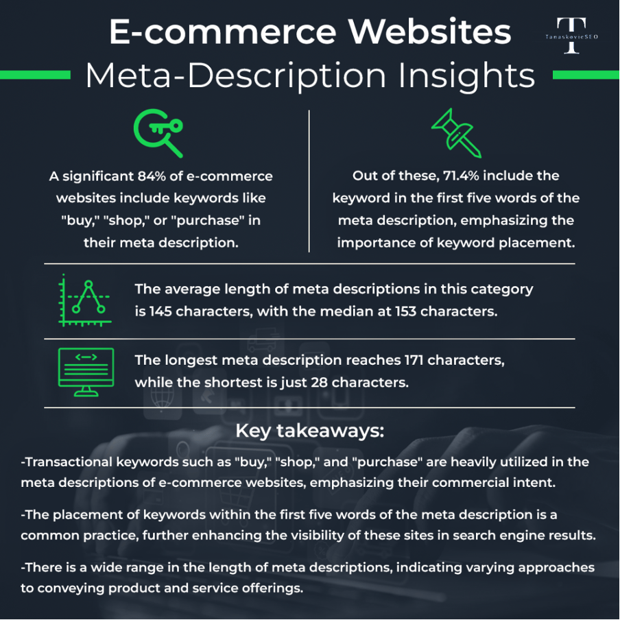 Average websites in the e-commerce category write meta descriptions that clock in at 145 characters, though the median number of characters in these descriptions is 153.