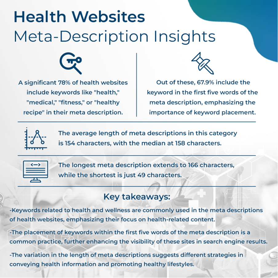 According to my research, 78% of top websites in this space use keywords like “health,” “medical,” “fitness,” and “healthy recipe,” in their page’s meta description tag. Moreover, 67.9% of these websites insert a keyword within the first five words of meta description text.